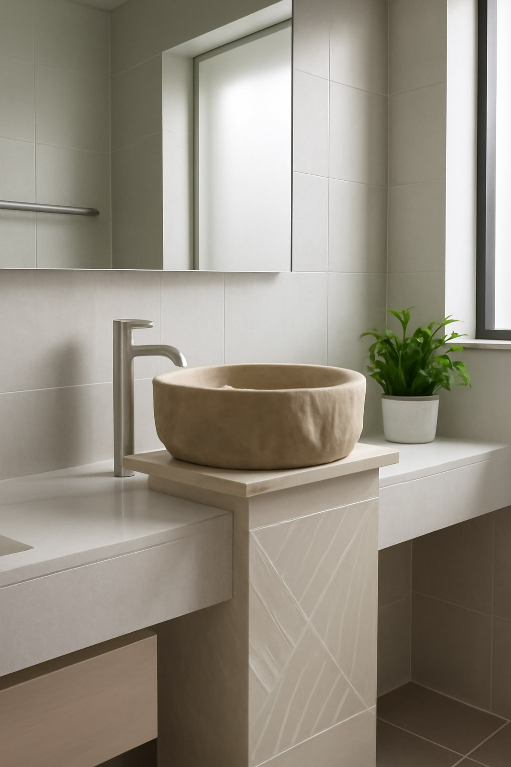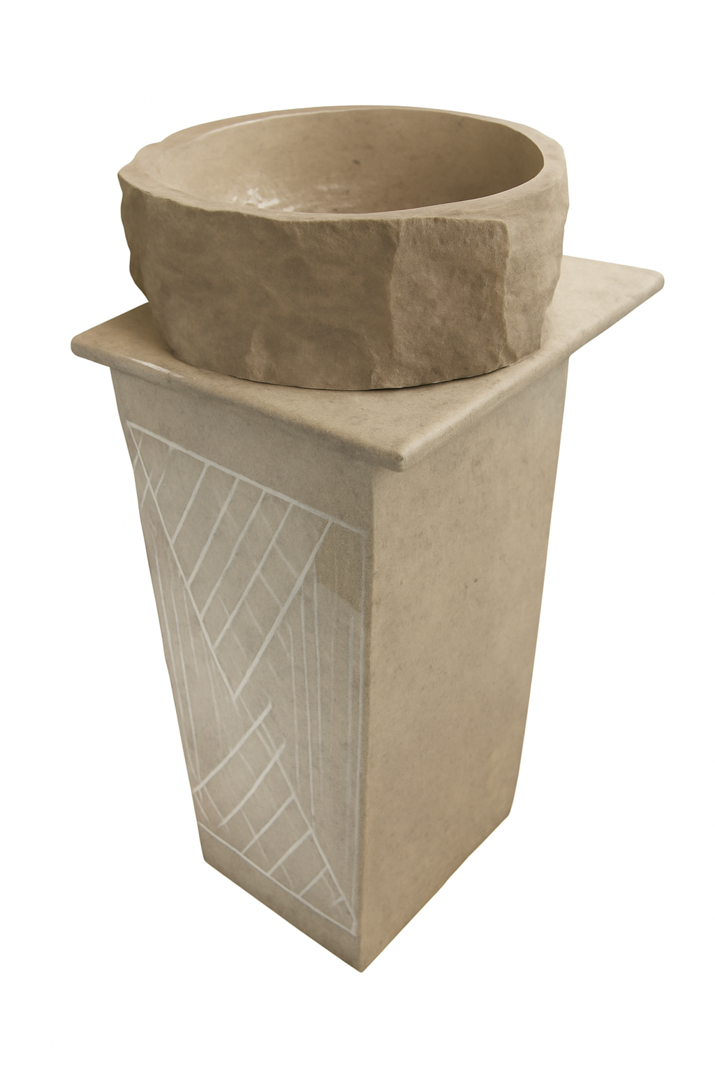 حوض رخامي قائم بذاته بتصميم يجمع بين الطابع الطبيعي والحديث؛ يتكوّن من وعاء دائري بملمس حجري خام يوحي باليدوية، مثبت فوق قاعدة مُضلّعة أنيقة بسطح علوي مسطّح وحواف نظيفة، مع زخارف هندسية محفورة بخطوط رفيعة على الواجهة تمنح الحوض حضوراً فنياً مميزاً. لونه البيج الرملي الدافئ ينسجم بسهولة مع أغلب خامات وألوان الحمامات العصرية والريفية على حدٍ سواء، ما يجعله قطعة محورية تلفت الانتباه دون مبالغة.