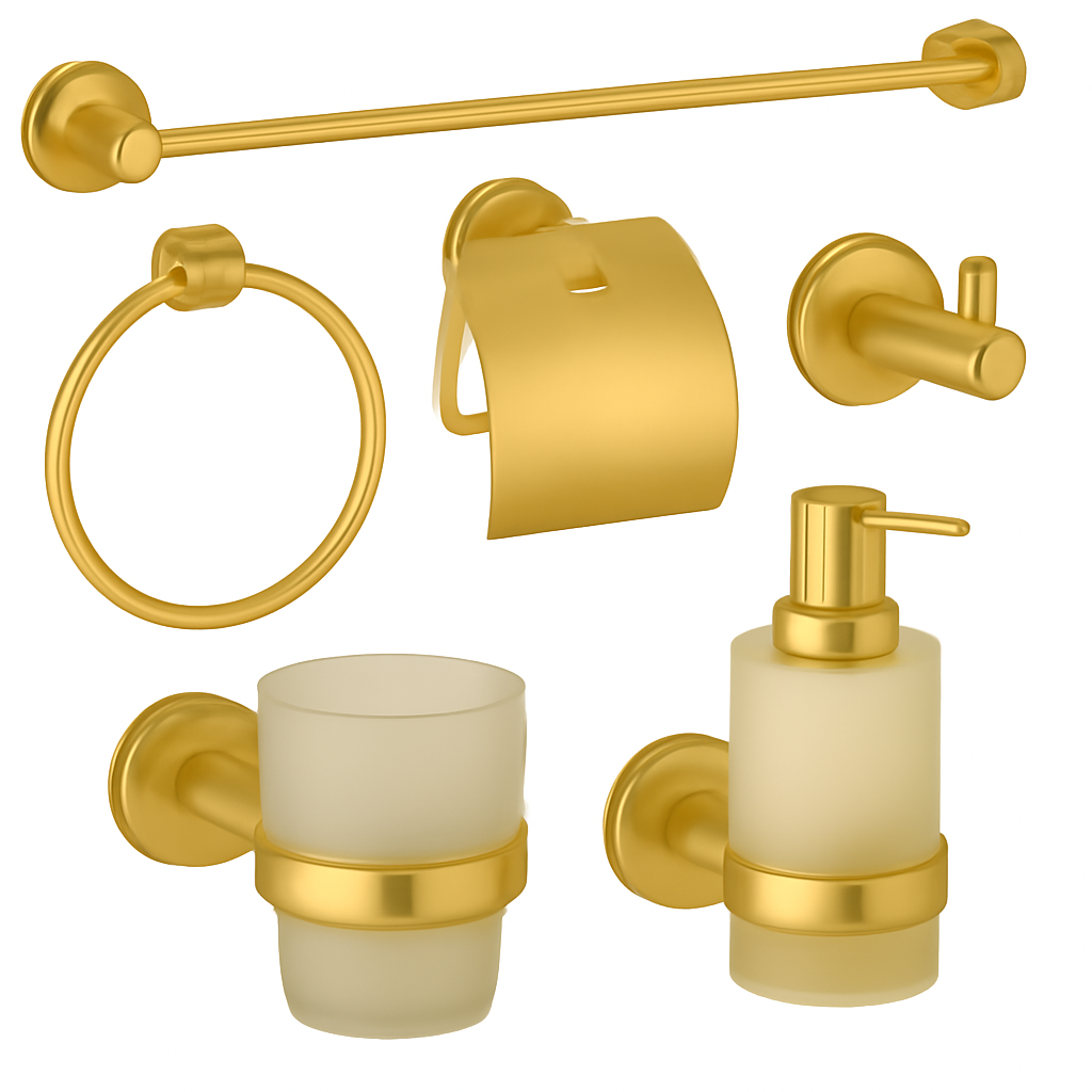 مجموعة إكسسوارات حمّام أنيقة بتصميم حديث بألوان مختلفة ، تضم فواطة طويلة، حلقة منشفة، حاملة ورق تواليت بغطاء، خطّاف متعدد الاستخدام، وحامل كوب وصحن صابون بزجاج معتم. مصنوعة من مواد متينة تقاوم الصدأ والرطوبة، وتأتي بتشطيبات ناعمة تمنح حمامك مظهراً موحداً وعصرياً مع سهولة في التركيب على الحائط وتوفير عملي للمساحة وتنظيم الأدوات اليومية.